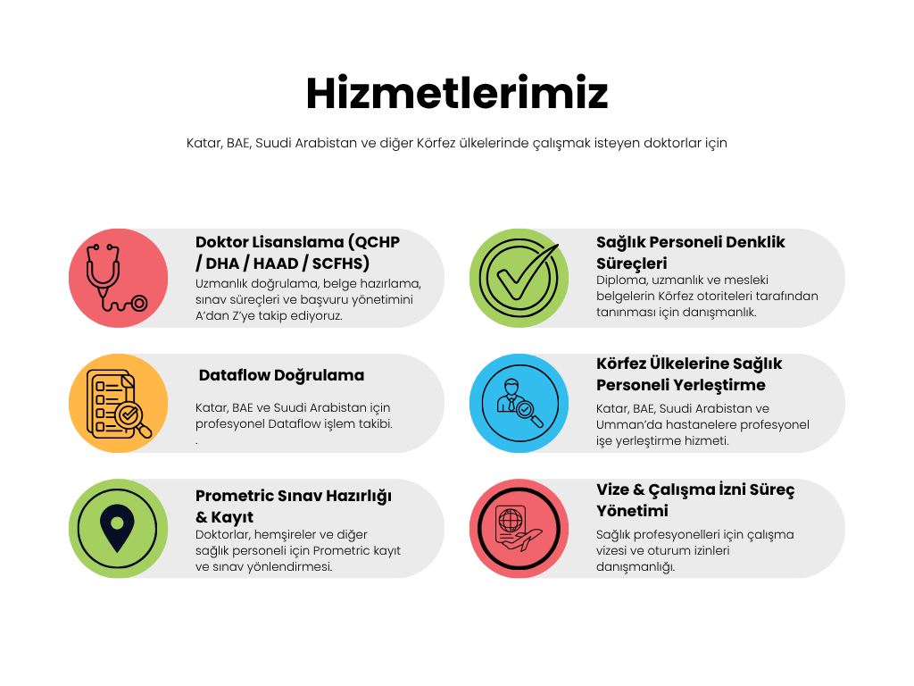 Körfez ülkeleri, son yıllarda sağlık sektörüne yaptıkları yatırımlarla dünyanın en hızlı büyüyen bölgelerinden biri haline gelmiştir. Katar, Dubai, Abu Dhabi, Suudi Arabistan ve Umman; modern hastaneleri, yüksek maaş politikaları ve güvenli yaşam koşullarıyla doktorlar ve sağlık personelleri için büyük fırsatlar sunmaktadır. Ancak bu ülkelerde çalışabilmek için oldukça detaylı ve teknik bir süreçten geçmek gerekir: Lisanslama, Dataflow doğrulama, Prometric sınavları, diploma denklik işlemleri, işe yerleştirme ve çalışma vizeleri.